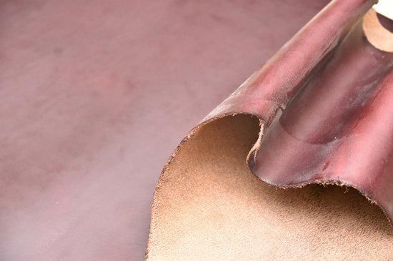 ブーツのアッパー用として、元厚のままでも”吊り込み”しやすいように、油脂成分を多く含ませて、銀(革の表面)を甘く作っているように思います。なので、厚みを1.0mm以下に漉くと想像よりもヘロヘロで伸びやすい印象をうける可能性があります。